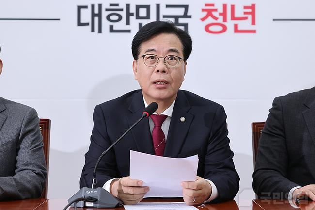 송언석 국민의힘 원내대표가 30일 오전 서울 여의도 국회에서 열린 원내대책회의에서 발언하고 있다.