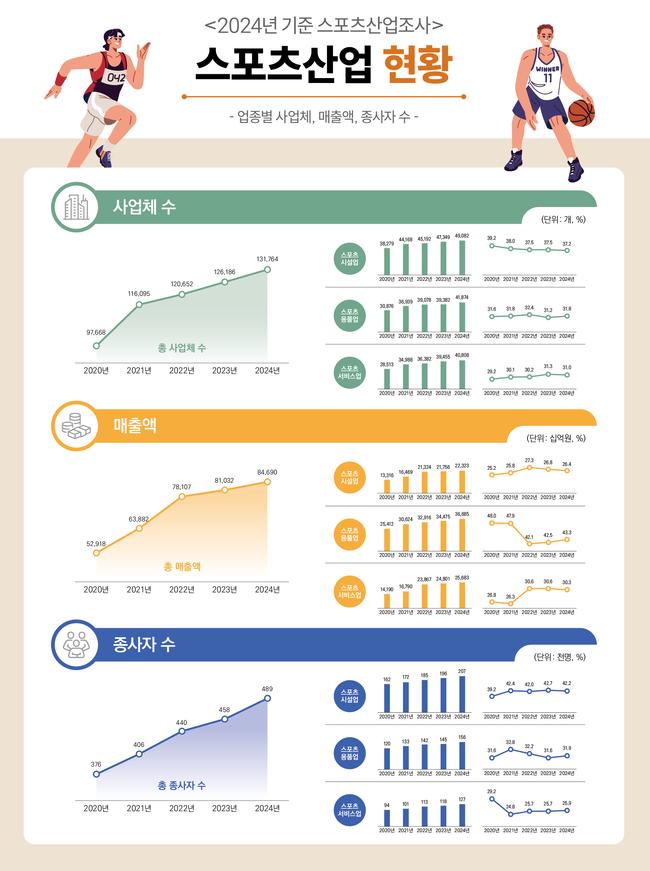 문화체육관광부가 8일 발표한 2024년 기준 스포츠산업조사에서 국내 스포츠산업 매출이 84조7천억 원으로 집계돼 전년 대비 4.5% 늘며 역대 최대치를 기록했다고 밝혔다.